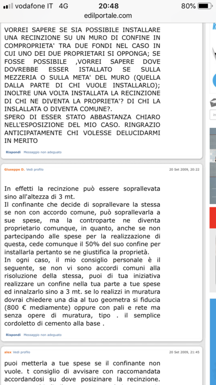 Chiarita la posizione del confine, la recinzione dovrebbe essere realizzata a cavallo dello stesso. Poiché la legge non prevede che la recinzione debba essere in comproprietà uno dei due confinanti può realizzarla, concordando la sua posizione. Se l'altro volesse appoggiare o usufruire del muro dovrebbe corrispondere la metà del costo per la sua realizzazione. Ovviamente anche la semi sede della fondazione deve essere pagata se fosse stata eretta all'interno della proprietà di chi l'ha realizzata. Se uno dei confinanti volesse sopraelevare la muratura, lo può fare a sua cura e spese, salvo che anche l'altro confinante voglia intervenire nella realizzazione. In caso contrario la parte eccedente sarà di esclusiva proprietà di chi si è accollato i costi per la sua realizzazione.